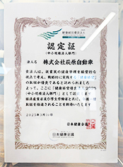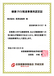 株式会社萩原自動車は、従業員の健康増進を重要視し、健康経営に積極的に取り組む企業であることから、令和4年8月24日付で全国健康保険協会茨城支部より健康づくり推進事業所として認定されました。