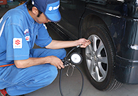 - 長く使って磨耗して溝が浅くなったタイヤや、空気圧が適切でないままのタイヤでは、制動距離が長くなったり、スリップしたり、最悪の場合破裂して大事故につながることもあります。見た目でチェックすることもできますが、定期的にプロの点検を受けてください。